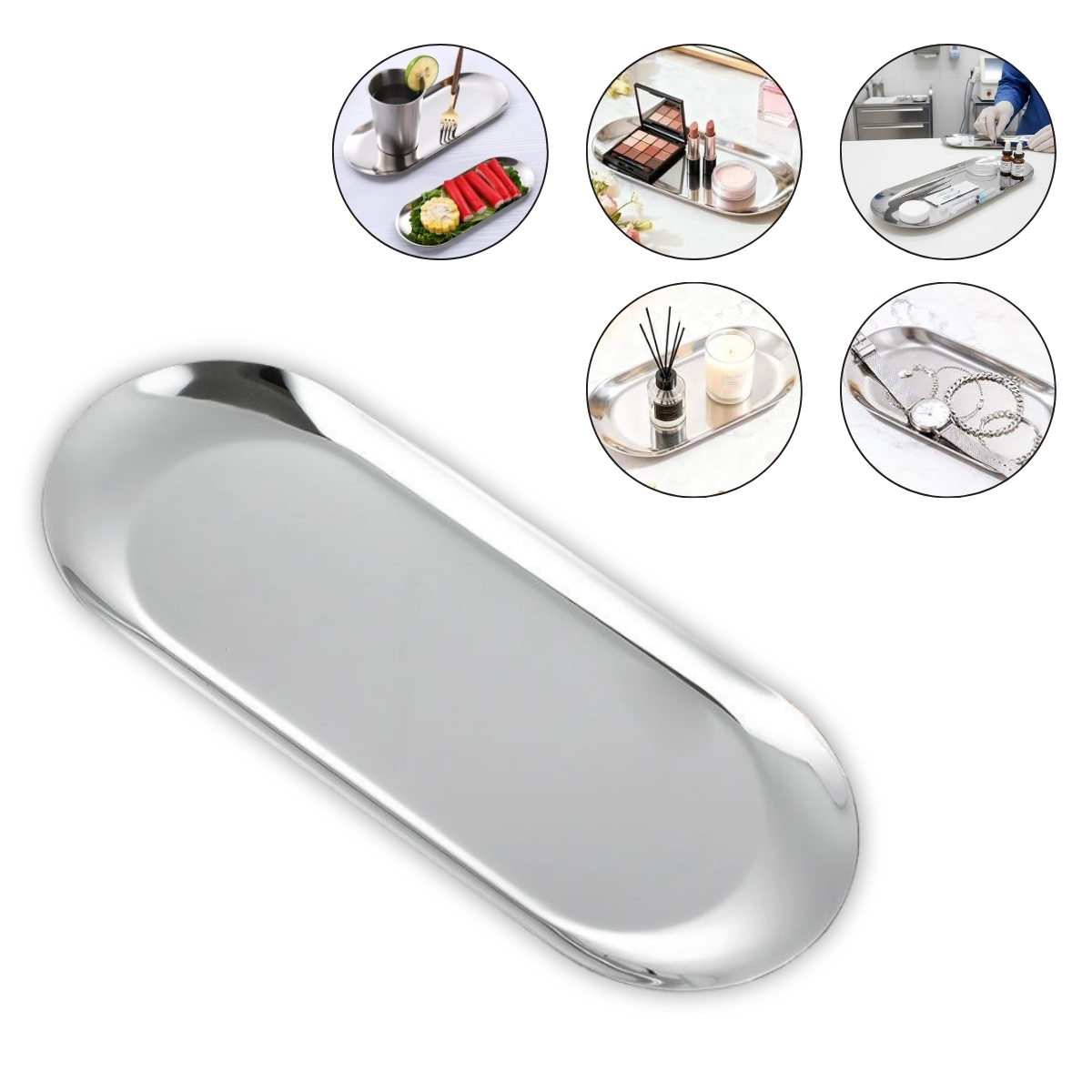 A Bandeja Oval é comumente utilizada para organizar itens pequenos ou servir em diversos ambientes. É fabricada em aço inoxidável de alta qualidade, assegurando durabilidade, resistência à ferrugem e facilidade na hora de limpar. Essa bandeja é um item versátil que pode ser usada em banheiros e quartos como organizador de cosméticos, toalhas de rosto, perfumes ou joias; em cozinhas e mesas para servir pequenas porções, petiscos, frutas e sobremesas, ou mesmo em ambientes profissionais como escritórios, clínicas odontológicas ou laboratórios para organizar instrumentos e materiais. Além de contar com um design simples mas elegante, ela pode ser facilmente limpa com um pano úmido ou em esterilizadores.