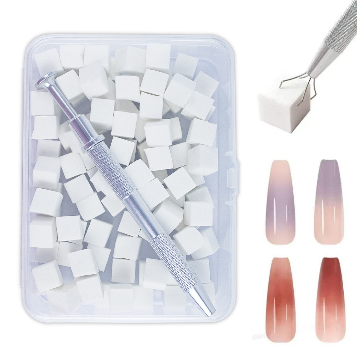Esse kit de 100 Mini Esponja Cubo + Aplicador com Garra é usado em diversas técnicas de nail art, principalmente para criar designs de unhas com efeito degradê, ombré ou baby boomer. Além de descartáveis, as esponjas são macias e porosas, o que as permite absorver e liberar o esmalte de forma controlada, evitando que o líquido escorra excessivamente ou forme bolhas. As mini esponjas também são excelentes para aplicar pigmentos em pó, glitters finos e pós holográficos. O aplicador em formato de caneta funciona como um pegador de quatro garras que segura firmemente as pequenas esponjas quadradas, oferecendo maior precisão no manuseio do que usar os dedos ou pinças comuns, assegurando que a esponja não caia e que a aplicação seja controlada. O kit oferece versatilidade e praticidade para criar designs de unhas com acabamento profissional em casa ou no salão.