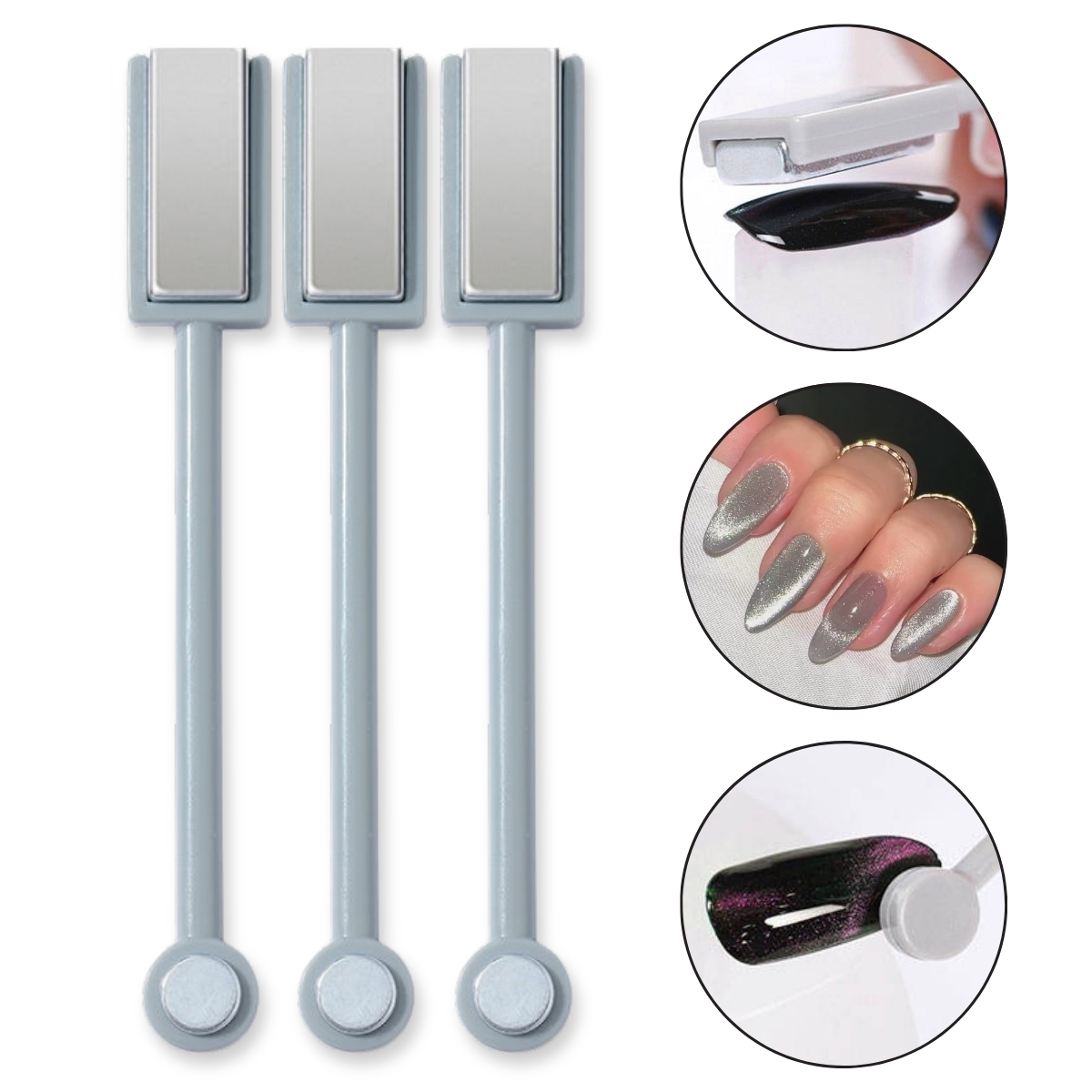 Esse kit conta com 3 unidades do Imã Magnético de Ponta Dupla, uma ferramenta essencial para quem deseja criar o efeito "olho de gato" (cat eye) em esmaltes magnéticos. O imã possui um design de duas pontas, com uma extremidade retangular e uma redonda, permitindo diferentes estilos de finalização. O cabo é longo e leve, o que facilita o manuseio e a precisão durante o uso. Ele auxilia na criação de um efeito 3D instantâneo, dando profundidade e brilho nas unhas, concentrando o pigmento conforme o movimento do imã. Cada extremidade permite diferentes desenhos: o lado retangular é ideal para criar linhas retas e nítidas, e o lado redondo cria curvas, círculos e padrões mais suaves. É uma ferramenta que permite a criação de nail arts complexas sem a necessidade de habilidades avançadas. Pode ser utilizado em esmaltes em gel com secagem em cabine ou em esmaltes comuns que possuem efeito magnético.