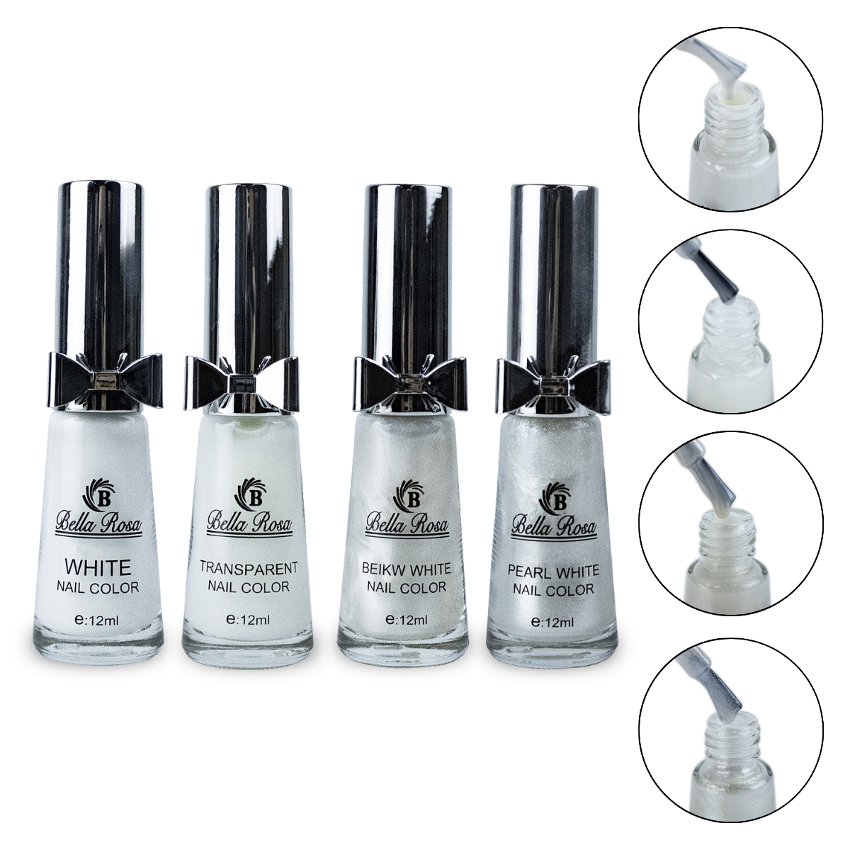 Esse kit de Esmaltes Bella Rosa reúne quatro cores clássicas e essenciais para unhas elegantes no dia a dia: branco, transparente, renda branca e branco perolado. Cada frasco contém 12ml e vem em uma embalagem delicada e moderna. As tonalidades claras e versáteis permitem desde acabamentos naturais até efeitos mais destacados, dependendo da combinação escolhida. Por oferecer diferentes variações de branco, esse conjunto é comumente conhecido como kit de francesinha, ideal para criar desde a tradicional ponta branca até versões mais suaves e modernas desse estilo. É uma opção prática tanto para uso profissional quanto doméstico, permitindo criar unhas com uma variedade de tons brancos e transparentes com diferentes acabamentos, desde um branco total até um perolado mais sutil.