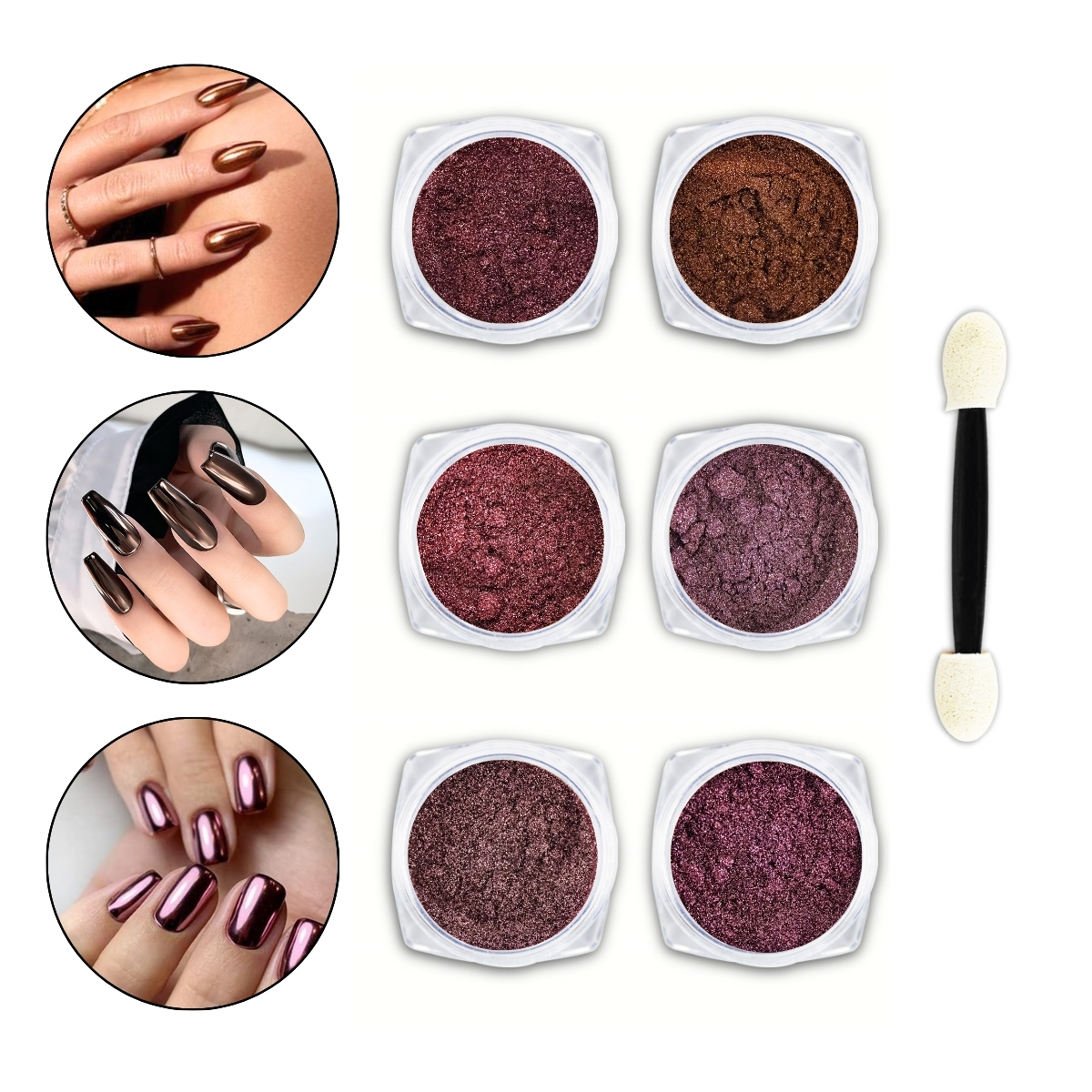 Esse kit conta com 6 unidades de Pó Cromado em variados tons de Marrom e Vinho, sendo ideal para manicures, profissionais de nail art ou mesmo para quem busca por unhas com um efeito espelhado em casa. O pó ultrafino oferece um visual elegante e ousado, auxiliando na criação de unhas cromadas e cheias de personalidade ao proporcionar um efeito espelhado intenso. É o kit perfeito para quem busca um brilho metálico nas unhas, seja para ocasiões especiais ou no dia a dia. O pincel aplicador facilita a aplicação do pó sobre as unhas de forma uniforme e precisa.