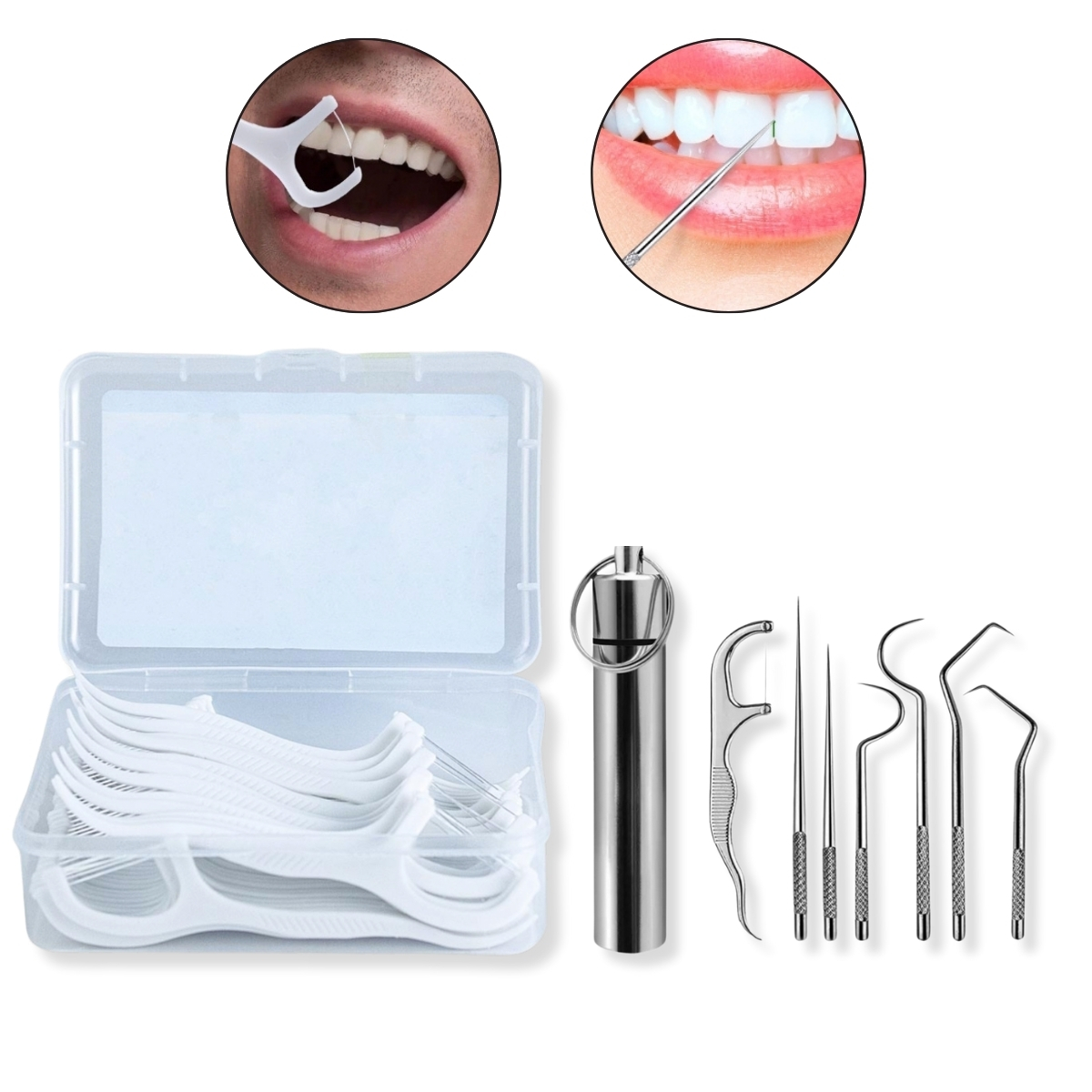- 7 instrumentos de limpeza dental em aço inoxidável;
