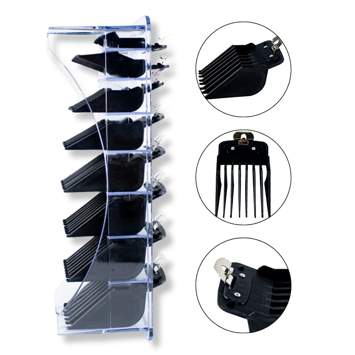 Os pentes acompanham um organizador vertical transparente, o que facilita a visualização e o acesso rápido a cada tamanho. O suporte ajuda a manter os pentes organizados, limpos e prontos para uso, além de dar um visual profissional ao ambiente de trabalho.