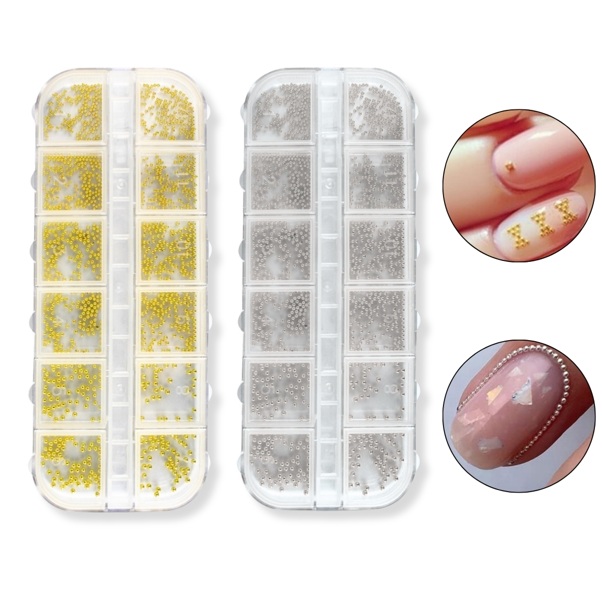 01 - Caixa com 12 Divisórias, com Mini Caviar para Decoração de Unhas, Prata.