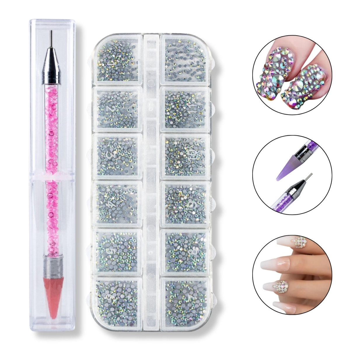 O strass furta-cor adiciona um toque luxuoso e sofisticado, refletindo a luz em diferentes tons conforme o ângulo. A caixa contém pedrinhas brilhantes em diversos tamanhos, permitindo criar efeitos delicados ou mais marcantes, sempre com acabamento elegante e moderno.