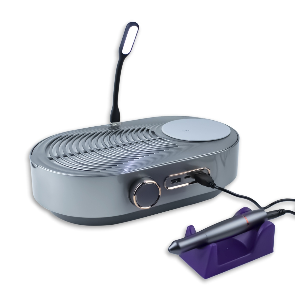 A Lixadeira 3 em 1 com Coletor de Pó de Unhas e Luz LED é o equipamento ideal para quem busca manter o ambiente de trabalho mais organizado e limpo durante procedimentos de lixamento. Com um sistema de sucção com filtro interno removível que torna mais fácil a limpeza e reutilização. O coletor possui controle de velocidade que permite ajustar a potência conforme a necessidade. Com um design compacto que proporciona mais conforto tanto para o profissional quanto para a cliente. Conta com uma lâmpada LED com conexão USB que proporciona uma melhor iluminação e visão das unhas. Recarregável e portátil, pode ser usado sem precisar estar ligado à tomada constantemente, o que o torna uma ótima opção para uso profissional ou doméstico. Possui duas entradas USB, permitindo que outros pequenos aparelhos sejam conectados e carregados durante o uso do coletor. Com botão de controle para ajuste de potência de sucção do coletor, é recomendado para procedimentos de unhas de gel, acrílico, polygel ou manutenções em geral. Também inclui uma caneta lixadeira que pode ser conectada a uma das entradas USB no próprio coletor ou usada separadamente, podendo ser ligada na tomada com o auxilio de um adaptador ou outros aparelhos que possuem entrada USB, como notebooks e power banks. A direção e velocidade da caneta podem ser ajustadas por meio dos botões do controle embutido no fio.